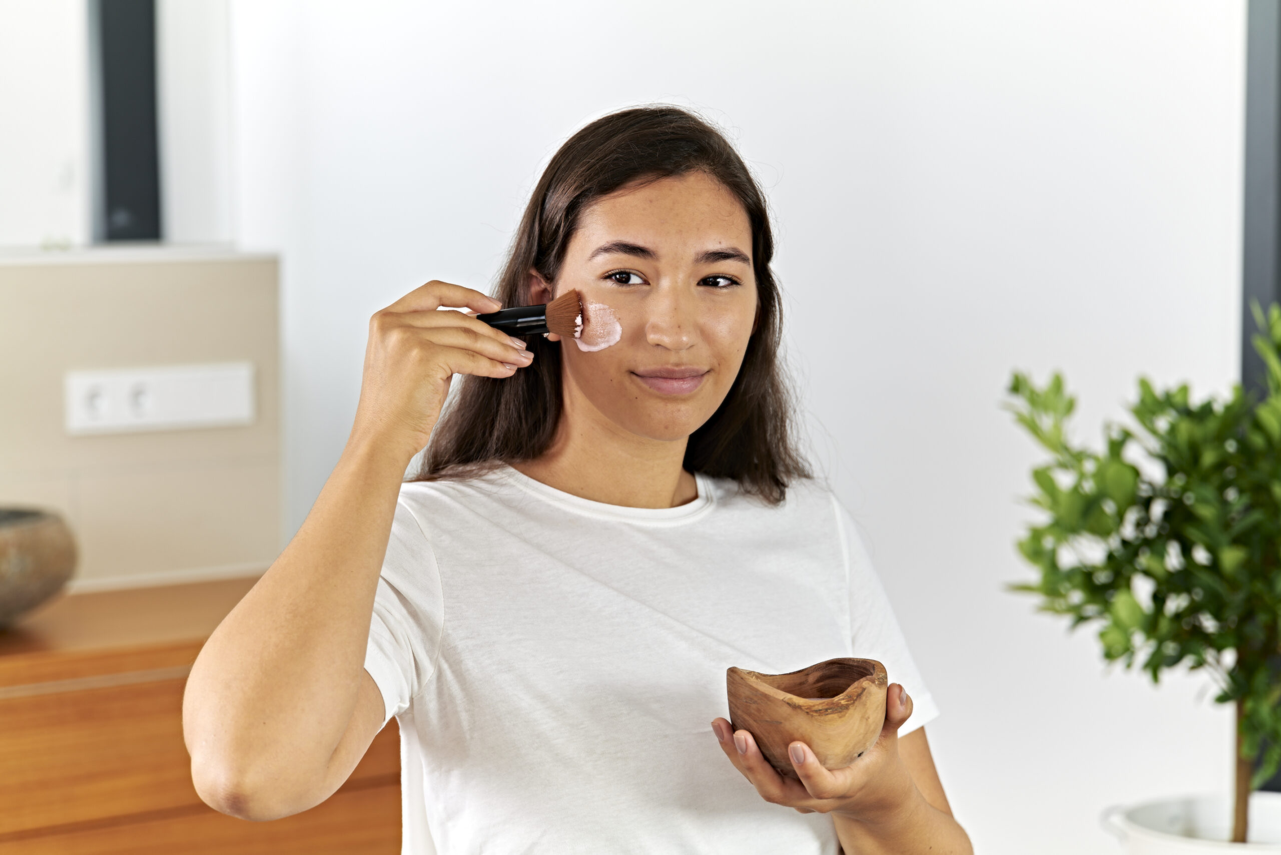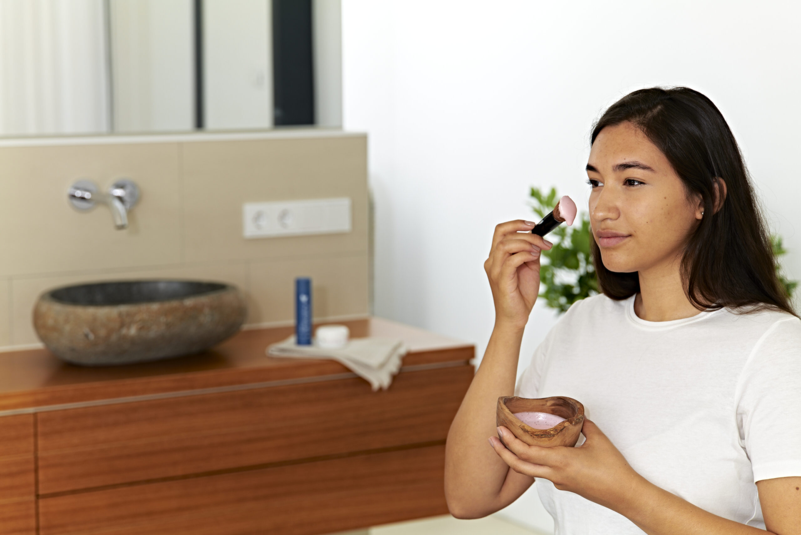 2. Mit einem Pinsel eine dünne, gleichmäßige Schicht von unten nach oben auf Gesicht und Hals auftragen.